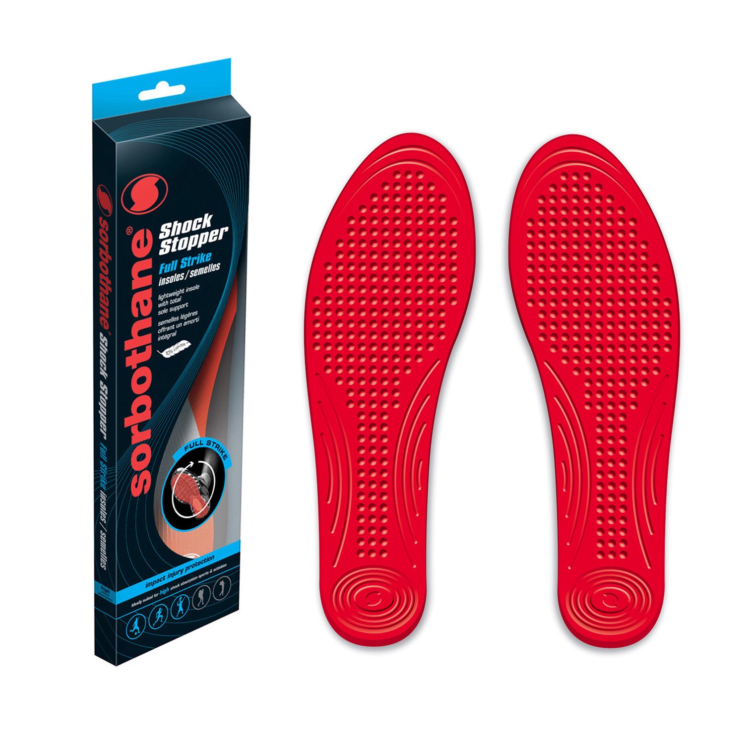Sorbothane is a unique synthetic material. which mimics the characteristics of human flesh. Its molecular structure allows it to recover its shape completely after each ‘shock’. It is used as an insole in footwear, it absorbs 94.7% of the shock waves caused by walking or running on hard surfaces. That means it reduces muscle fatigue, helps protect weak joints and eases the strains on ligaments and tendons. So, whether you want to prevent sports’ injuries, alleviate the symptoms of existing conditions or simply cope with the physical stresses and strains of modern life, we promise that Sorbothane Shock Stoppers will help you. Suitable for sport, leisure and outdoor footwear.
